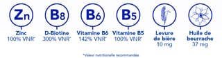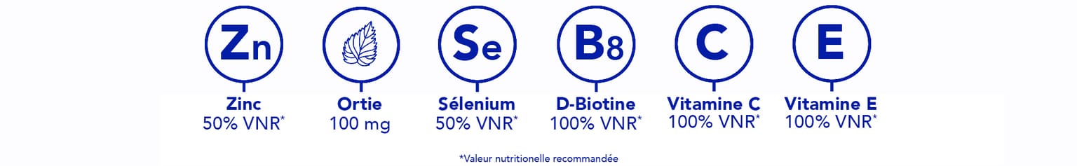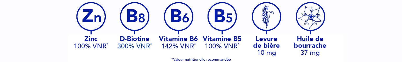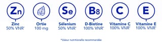 (1)Le zinc contribue au maintien de cheveux et ongles normaux. La vitamine B6 qui contribue à la synthèse normale de cystéine. (2)Le zinc contribue aussi à une synthèse protéique normale. (3)Etude clinque, 104 volontaires, 3 mois, 2 capsules par jour, % de satisfaction