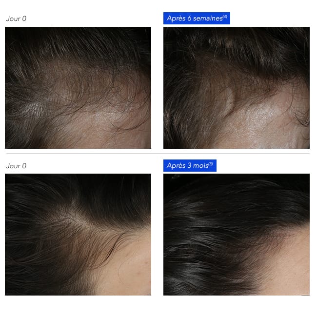 (2)Etude clinique, 40 femmes, 3 mois – cas n°12 représentatif de la moyenne de l’augmentation de la densité. (3)Etude clinique, 52 femmes, 3 mois - test de traction capillaire. (4)Etude clinique, 52 femmes, 6 semaines - % de satisfaction.