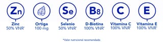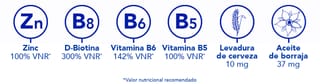 (1)El zinc contribuye al mantenimiento del cabello y las uñas normales. La vitamina B6 contribuye a la síntesis normal de cisteína. (2)El zinc también contribuye a una síntesis proteica normal. (3)Estudio clínico, 104 voluntarios, 3 meses, 2 cápsulas al día, % de satisfacción